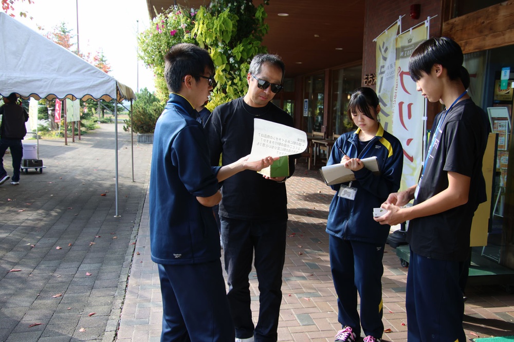 今回は「まちおこしプロジェクト」の一環。事前にほかの地域の「道の駅」を調べ、人気のある道の駅と風連の道の駅との違い、課題を自分たちで考えました。今回は利用者の意見を聞き、自分の感じたことと実際の利用者の声から、「よりよい道の駅」を作るにはどうしたらいいのか考えます。最初は遠慮がちだった生徒たちも少しずつ慣れてきて買い物終わりの利用者さんにお話を聞くことができていました。「利用頻度は?」、「利用目的は?」、「道の駅にどんな施設が併設されてたらいい?」、「他にどんなものが売っていてほしい?」、各班で考えた課題解決に向けた質問を投げかけると、多くの利用者が快く答えてくれ、インタビュー後には「がんばってね」などの声をかけてくれる方もいました。