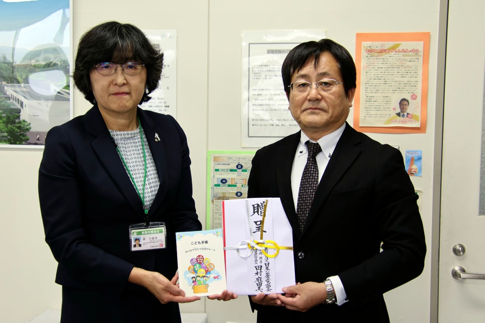 公益財団法人日本公衆電話会北海道統括支部の三島久佳事務局長らが名寄庁舎教育長室を訪れ、「こども手帳~みんなで守ろう社会のルール」220冊を寄贈しました。市内の小学4年生へ配布されるほか、電子版が各小学校に1冊ずつ提供されます。