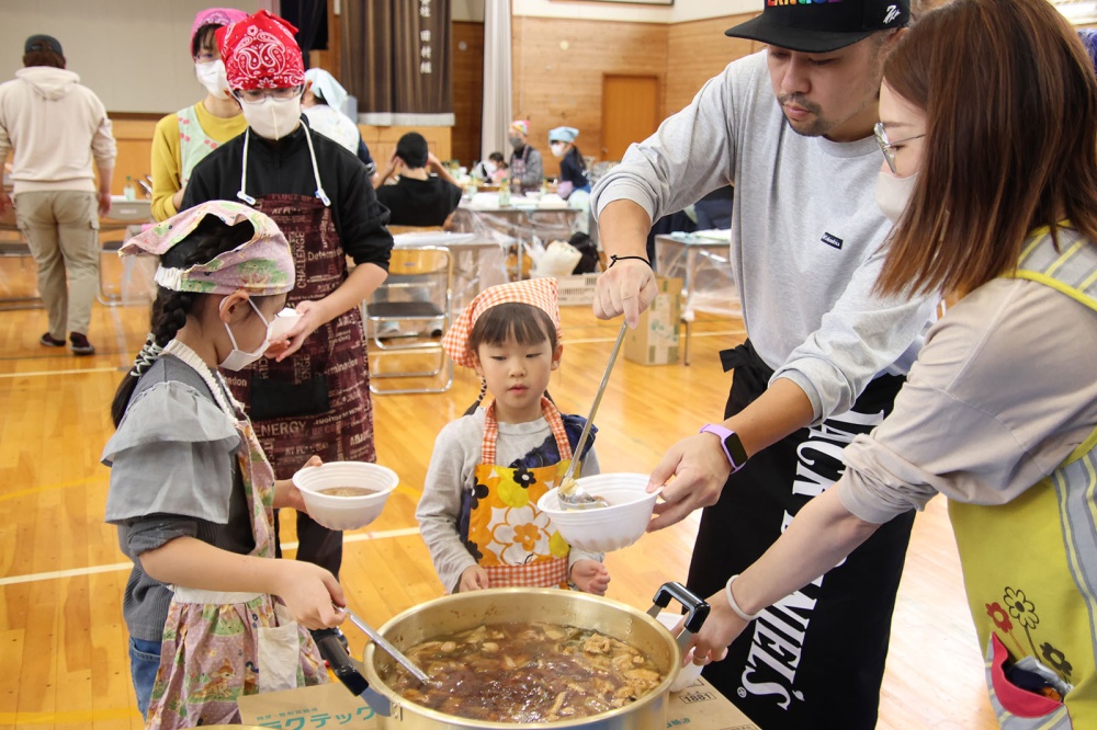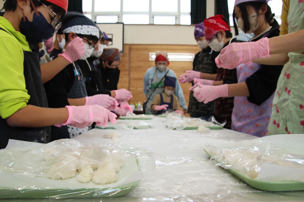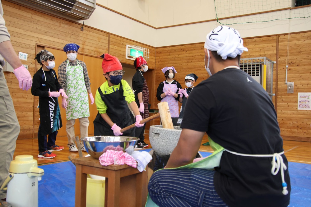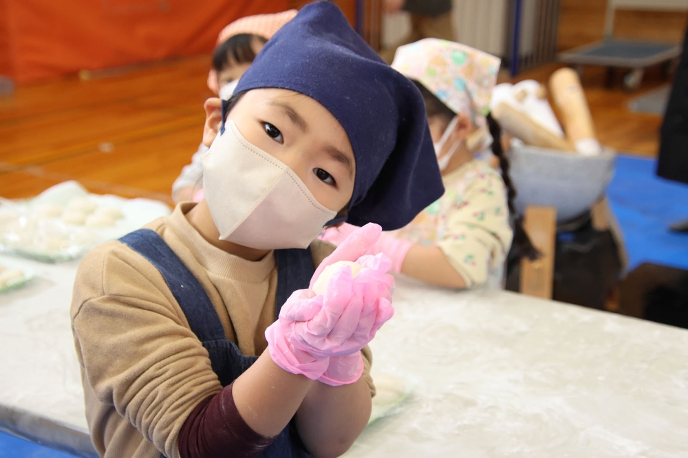 ホッカホカでつやつやのもち米を大人たちがぺたんぺたん!少しまとまってきたおもちを子どもたちがぺったんぺったん。みんなでついたおもちはつく前とはちがうつやつや。もち米はなめらかなおもちに変身しました。ついたおもちはみんなでコロコロ丸めます。大きさも形もみんなバラバラ、全部がおいしそう。PTAのみなさんが事前に作ってくれたお雑煮のおつゆも具沢山でおいしそう。みんな列に並んで順番を待っていました。おつゆをついだらみんなで丸めたおもちを入れて、いただきます!みんなで作ったおもち、お雑煮はおいしいね。