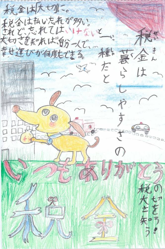 「初めて税金の役割を知りました。暮らしを支える大切な税金のことを、みんなに伝えたいと思って一生懸命描きました。賞をもらえたことも、作品を通して自分の気持ちを伝えられたことも、嬉しいです。」と千葉さん、「税金が正しく使われて、みんなの未来がもっと明るく良くなってほしいという願いを込めて描きました。税金について深く考えるきっかけになったし、頑張って描いた甲斐がありました。」と田畑さんが、それぞれ受賞の喜びと作品の感想を話しました。