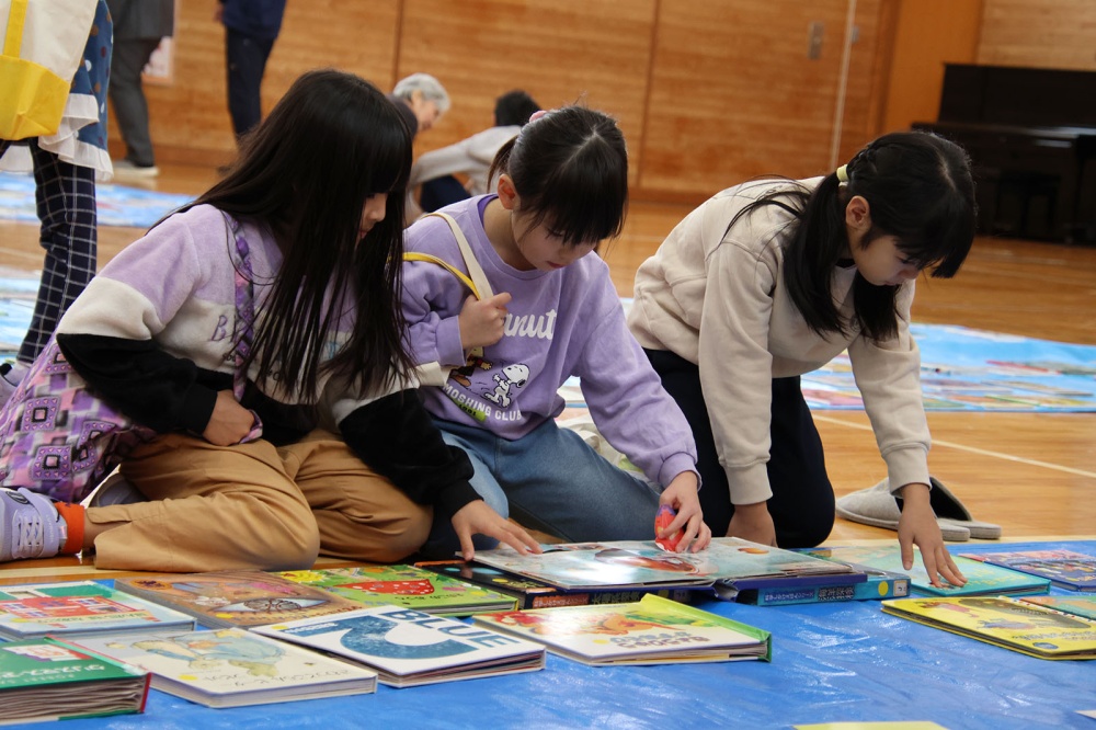 オープニングは名寄本読み聞かせ会の読み聞かせでスタート。絵本「ありがとうのうたをうたえば」と紙芝居「じごくけんぶつ」、児童たちは真剣に本・紙芝居を見つめていました。読み聞かせが終わって振り返ると、そこには体育館いっぱいに敷き詰められた本。気になった本は10冊以内でそのまま貸し出しが可能で、冬休みの期間中借りられます。児童たちは思い思いに本を見て回り、気になる本を手にとってはカバンに入れていました。壁には物語のとおりに進まないとお話が続かない「おはなしめいろ」、貸出はできないけどその場で読むことができるいろいろな仕掛けがある「しかけ絵本」の展示などもあり、普段見ることのない「本」の形に児童たちは興味津々でした。