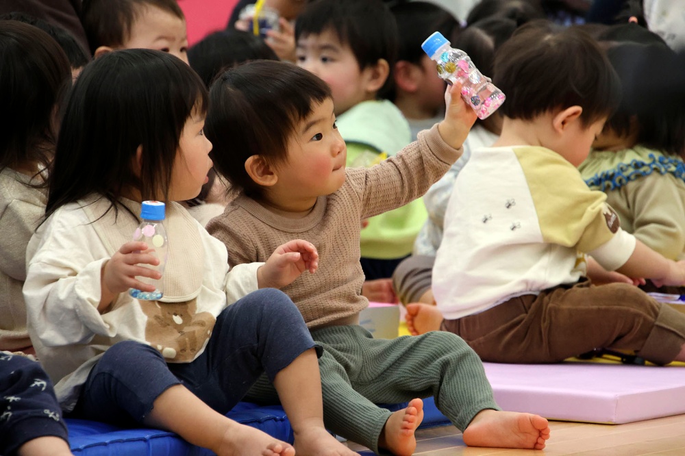 会場には「さんぽ」や「ぼくたちぶどう」などの楽曲が響き渡り、園児たちは目を輝かせながら、思い思いに作った楽器を手に、演奏に合わせて体を揺らしました。