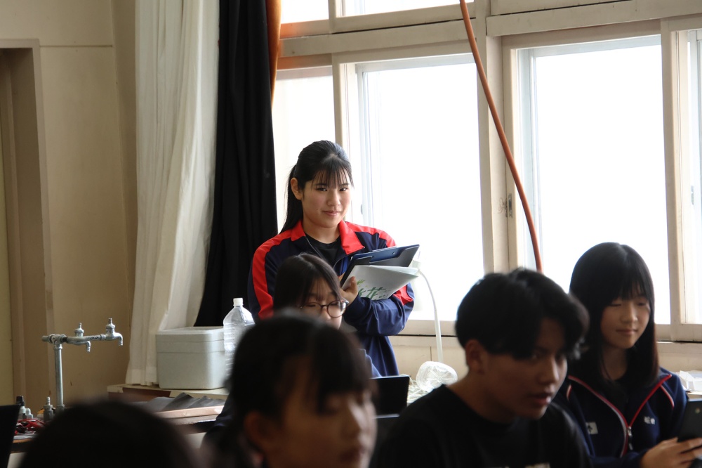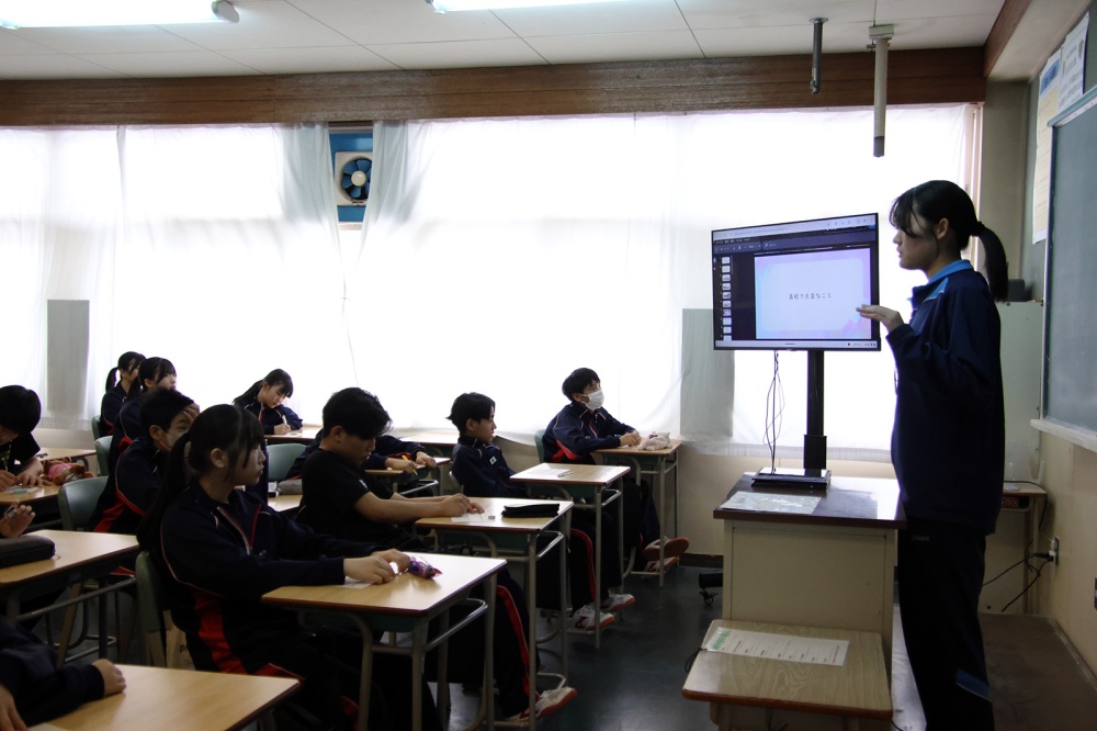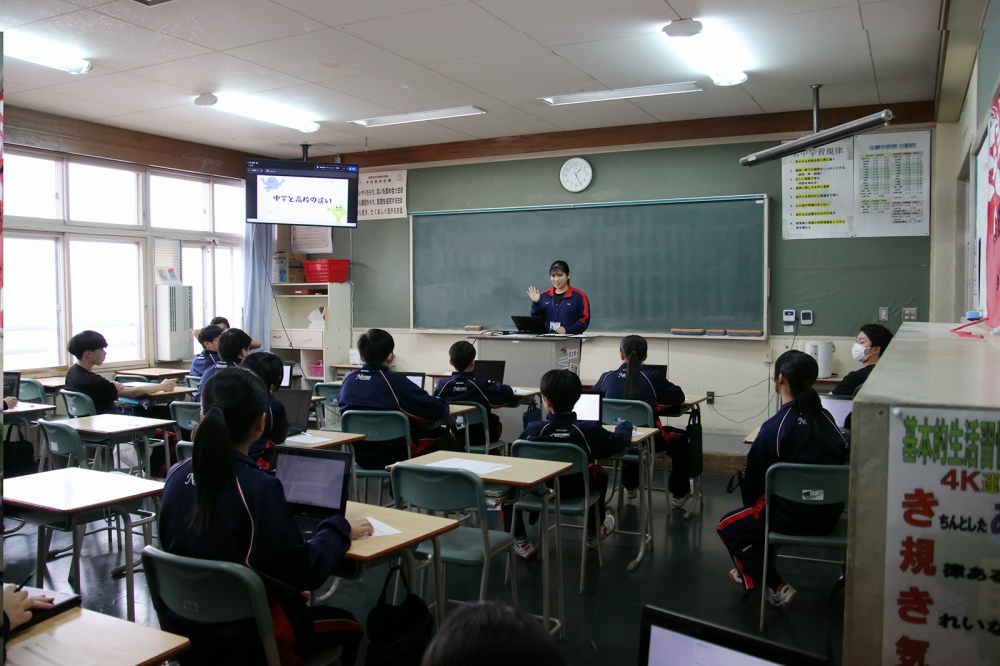 参加したのは穴吹梨音さん(1年)、刈谷友愛さん(1年)、鬼原悠叶さん(1年)、五十嵐優来さん(2年)、三浦唯翔さん(2年)、5人はみんな将来教員を志す名寄中学校の卒業生です。1日目は授業見学や若手教員との座談会など。2日目は実際にスライドを使って短い時間で授業を行います。テーマは「中学校と高校のちがい」、「高校生活の楽しい・大変」、「中学生のうちにがんばること」など。中学生へのクイズや問いかけなども交えながら、実習生それぞれがこれまでの経験をもとに中学生に伝えました。